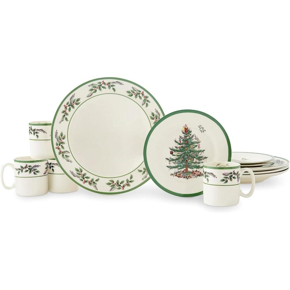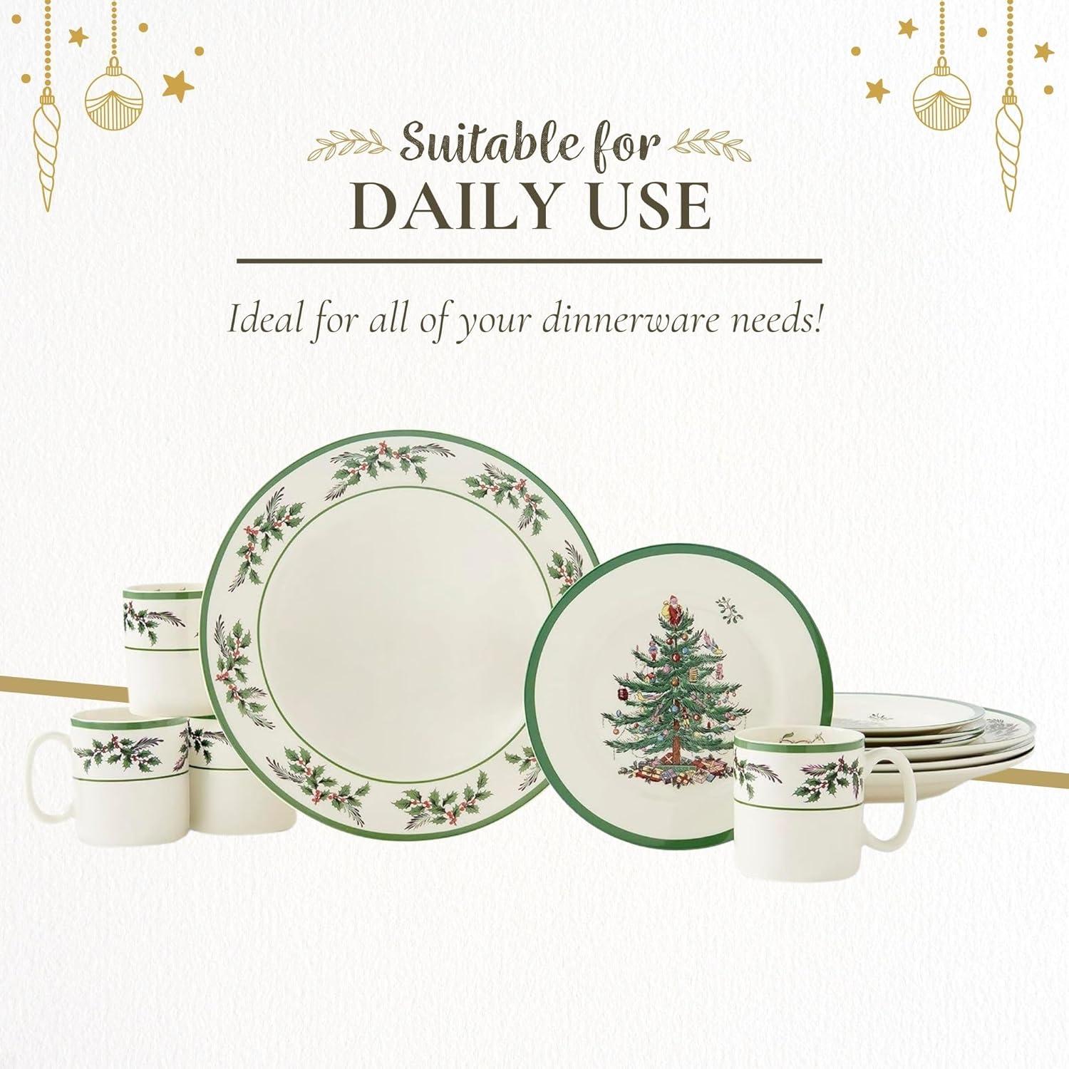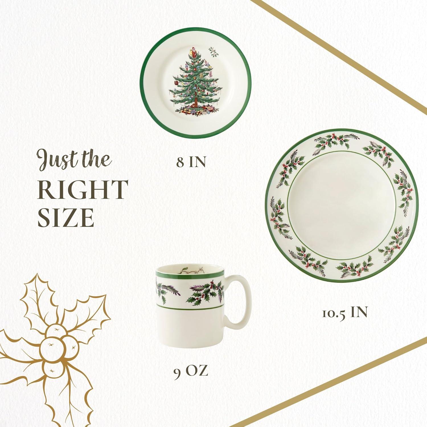 Festive Dinnerware Set of 4: This holiday dinnerware collection includes 4 holly-accented 10-inch dinner plates, 8-inch Christmas tree salad plates, and holly-decorated 9-ounce mugs, providing a festive look for family meals and holiday gatherings.