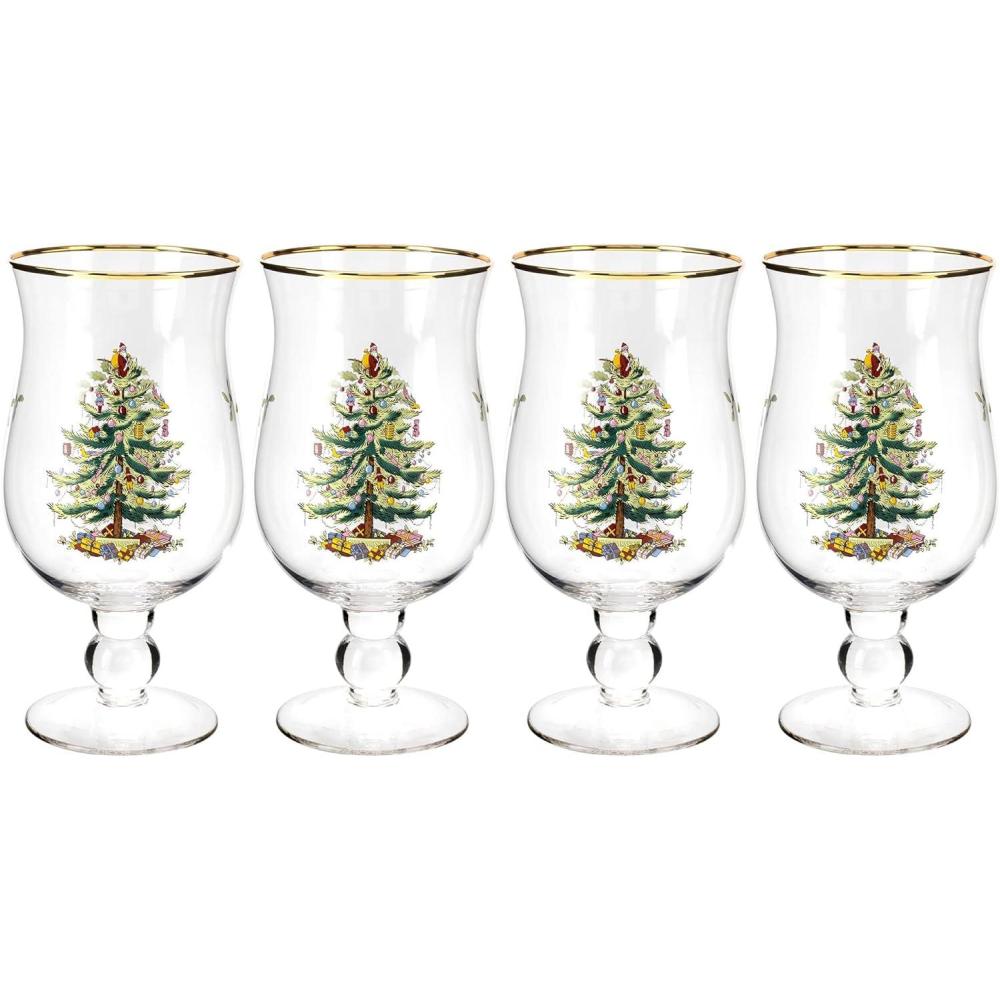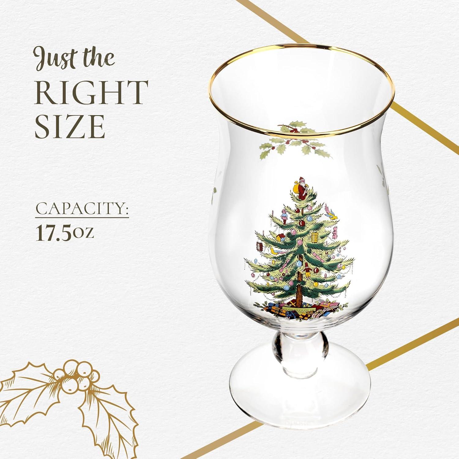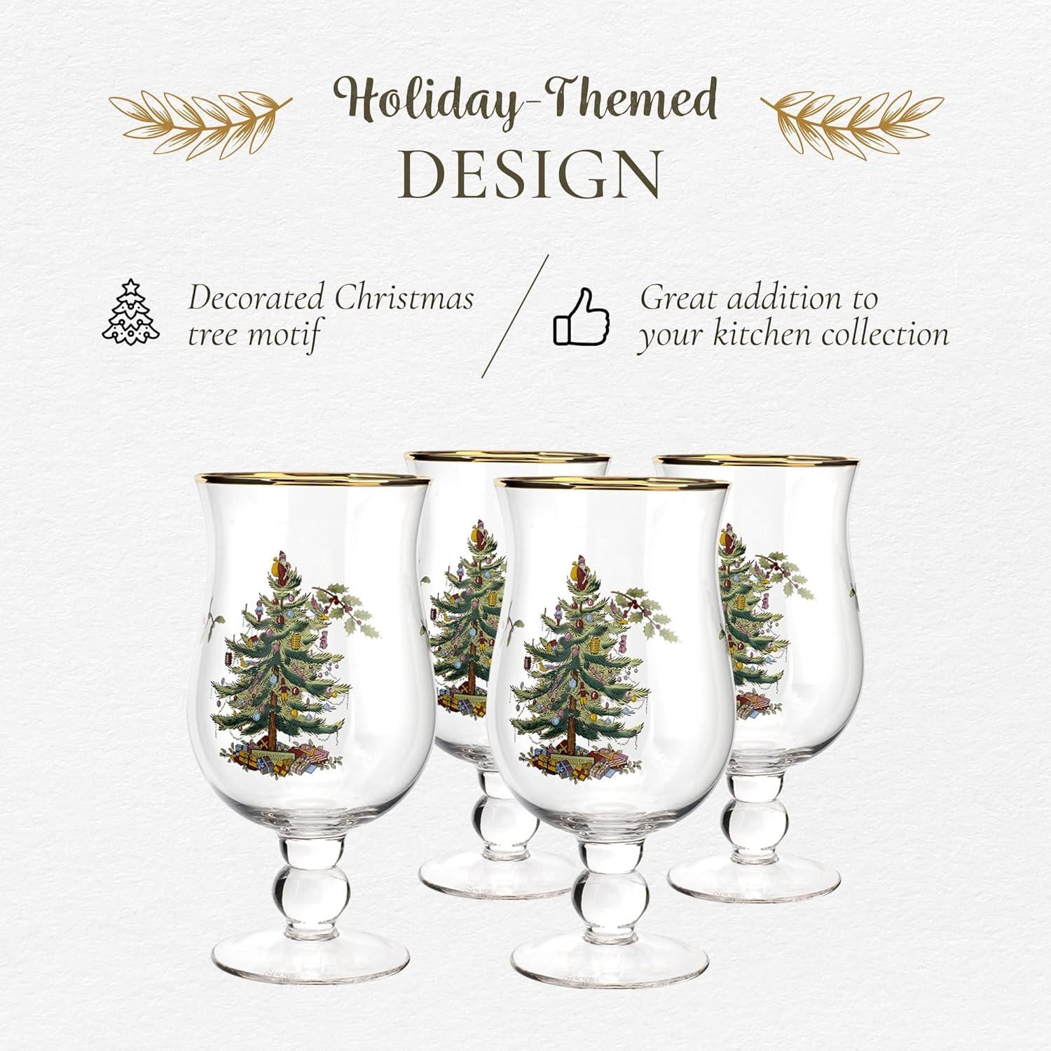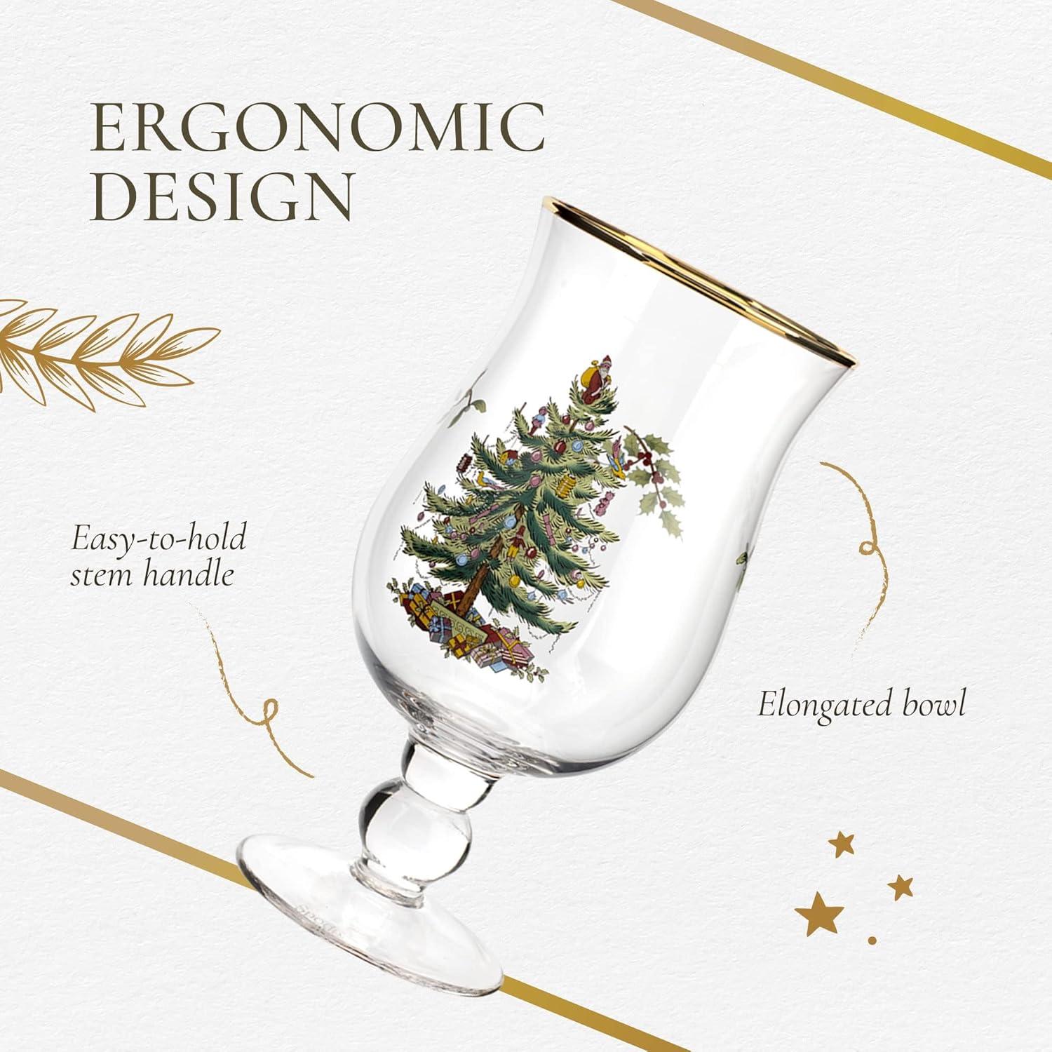 Elegant Holiday Design with Gold Trim: Celebrate the season with these 22-karat gold-trimmed glasses, featuring a classic Christmas tree design. The luxurious gold rims add a touch of elegance to your holiday table, making every sip special.