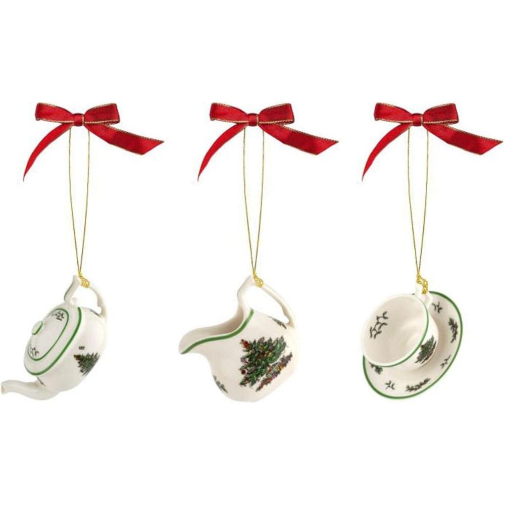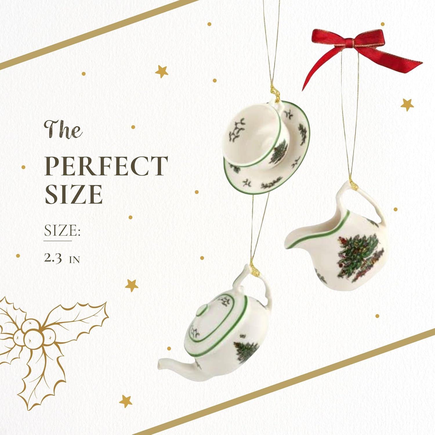 Spode Christmas Tree 3-Piece Tea Set Ornament, Durable Holiday Ornament for Festive Decor & Winter Wonderland Display - Sleek Seasonal Ornaments for Tree, Mantel, Holiday Home Decoration