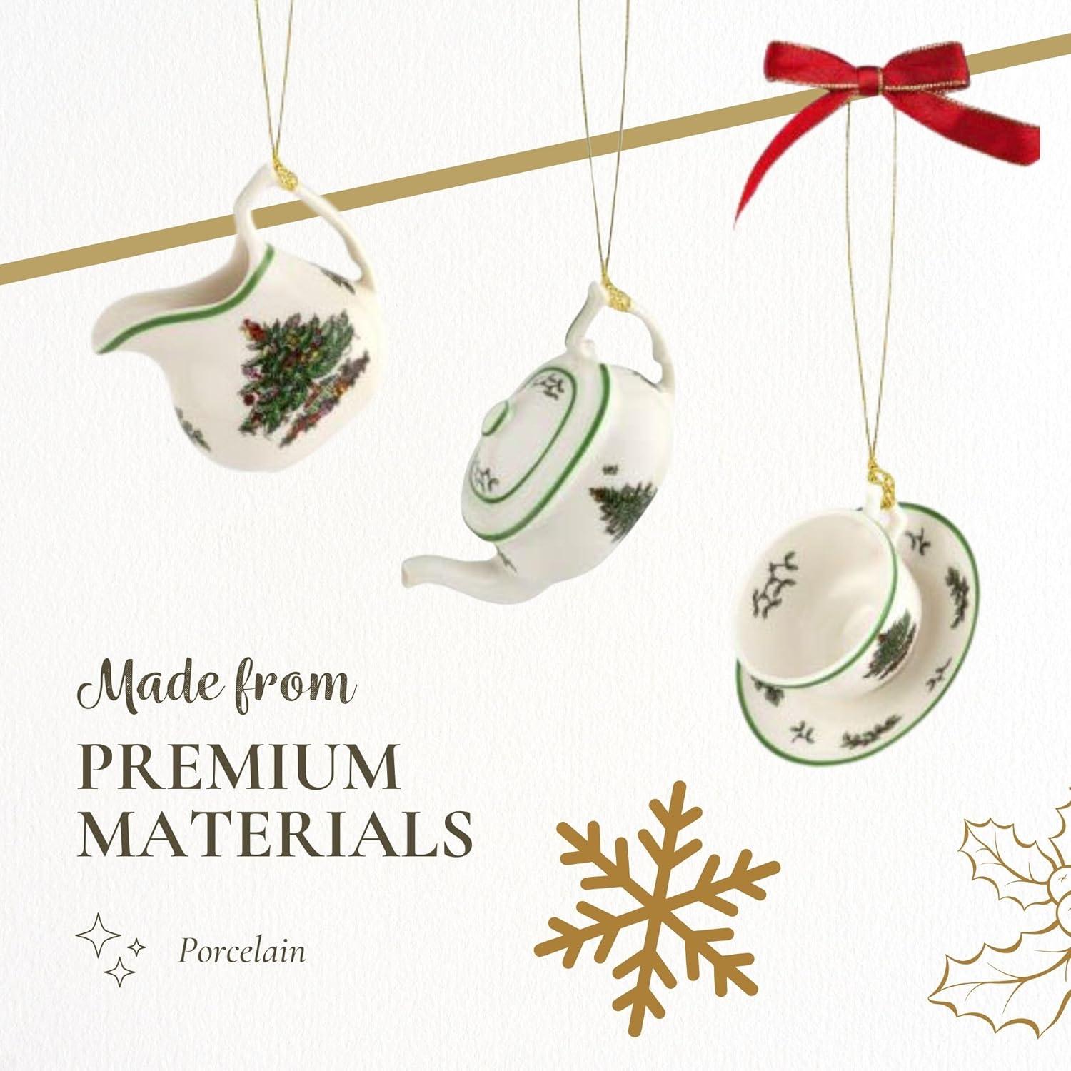 Mix & Match Our Full Collection: This 3-Piece Tea Set Ornament is designed to complement the rest of the Christmas Tree Collection, allowing you to mix and match for a unique look. Combine them with other pieces for a customized, cohesive festive decor setup throughout your home.