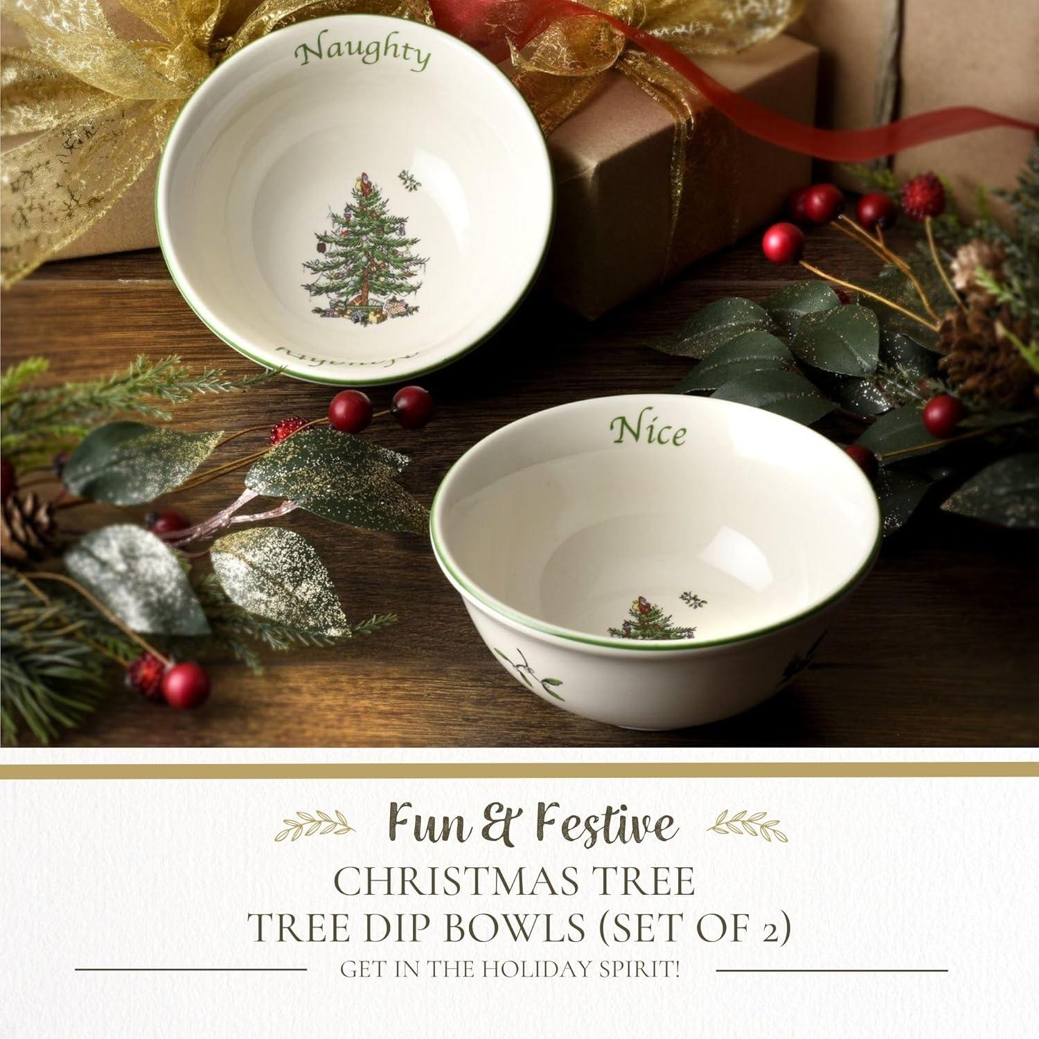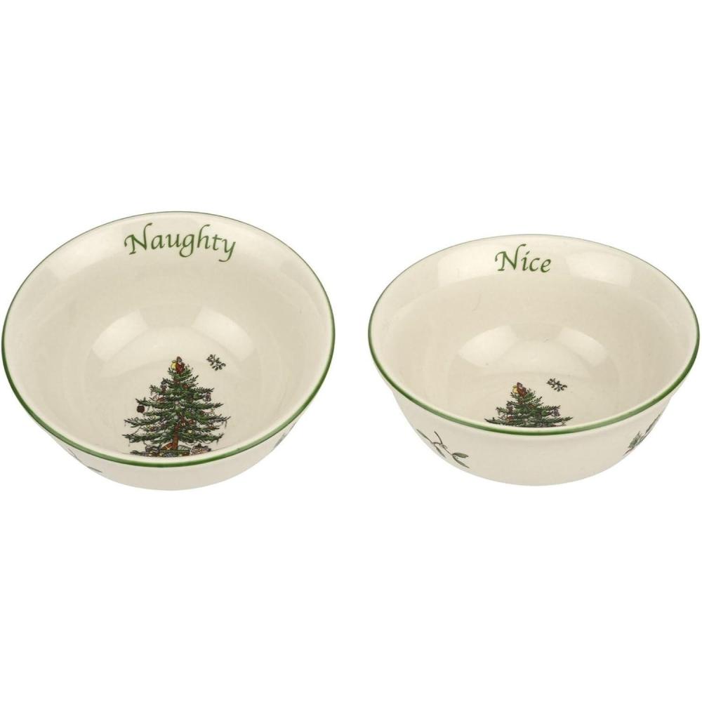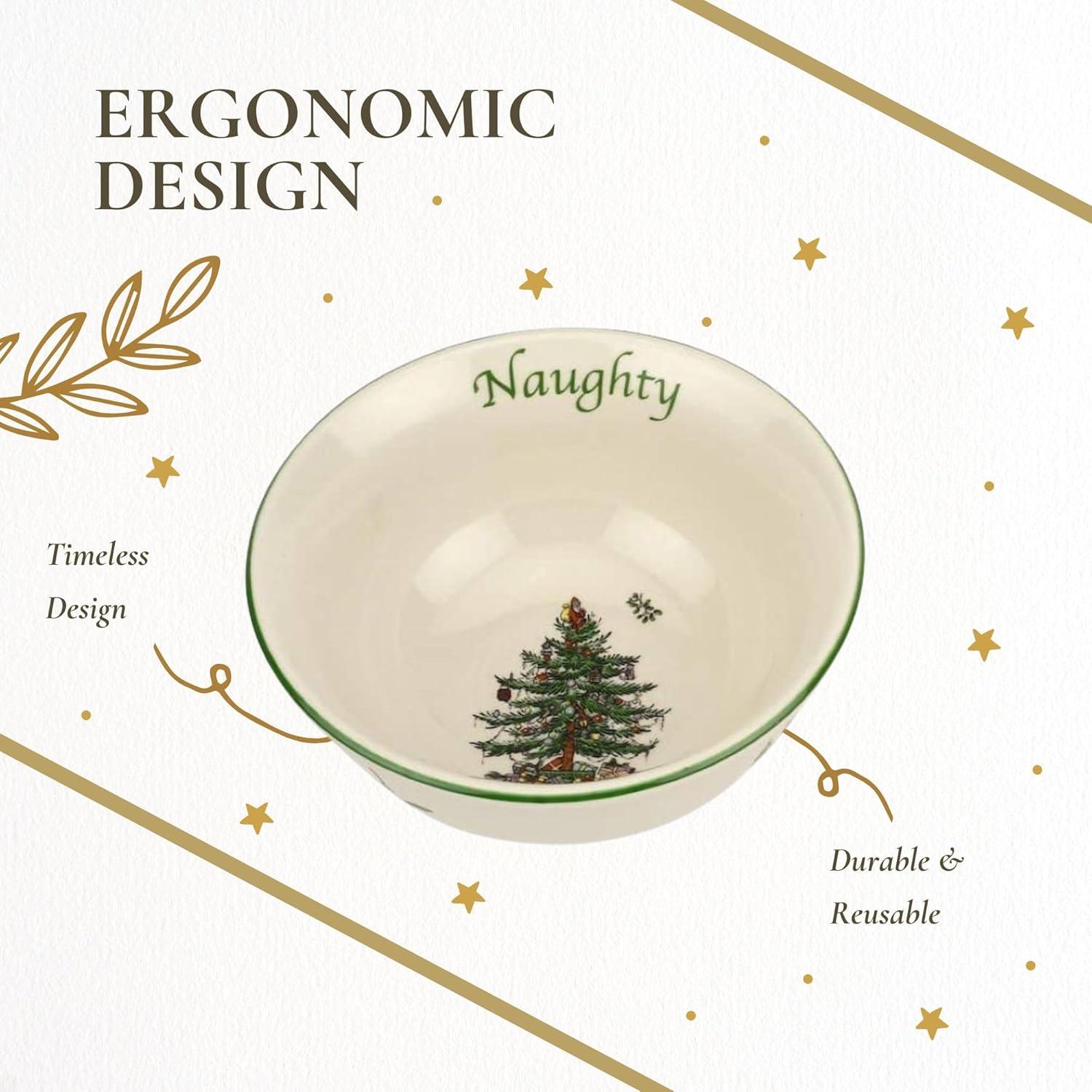 Classic Christmas Tree Motif: Featuring the iconic Spode Christmas Tree design with forest green banding, these bowls add a traditional and elegant touch to your holiday table settings. The “Naughty” and “Nice” labels bring a playful element, making them a delightful centerpiece for your holiday gatherings.