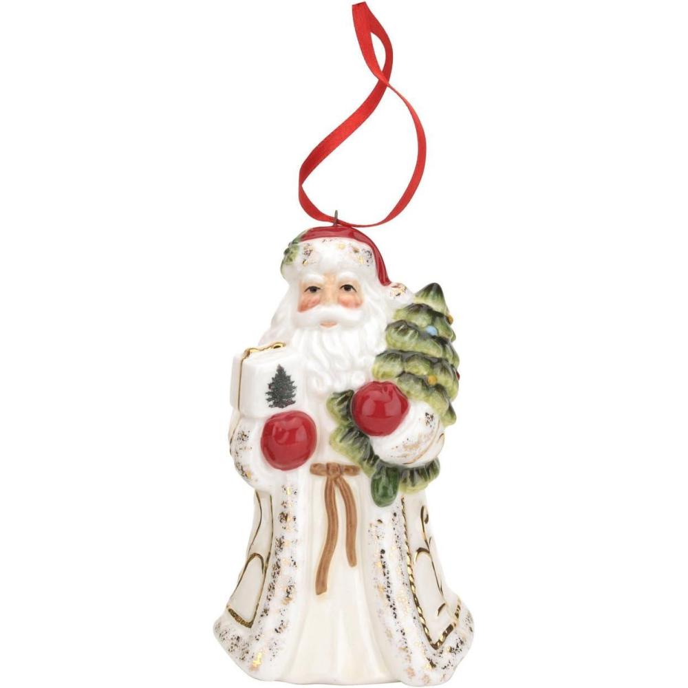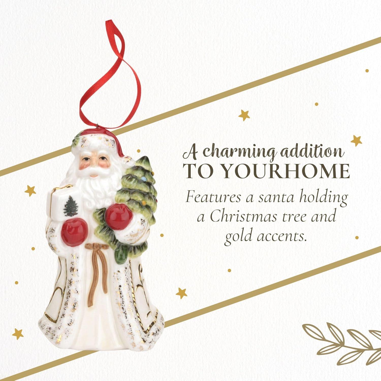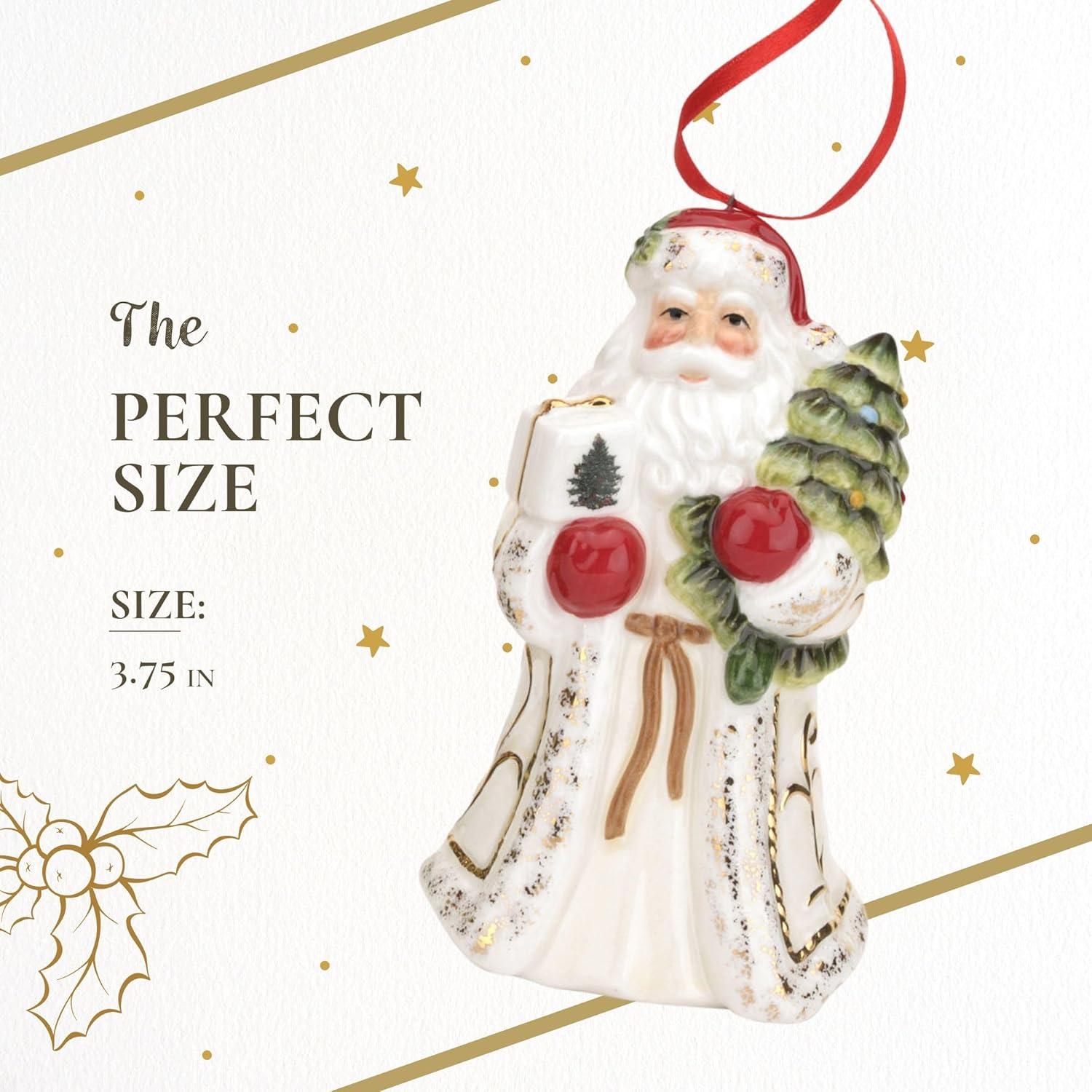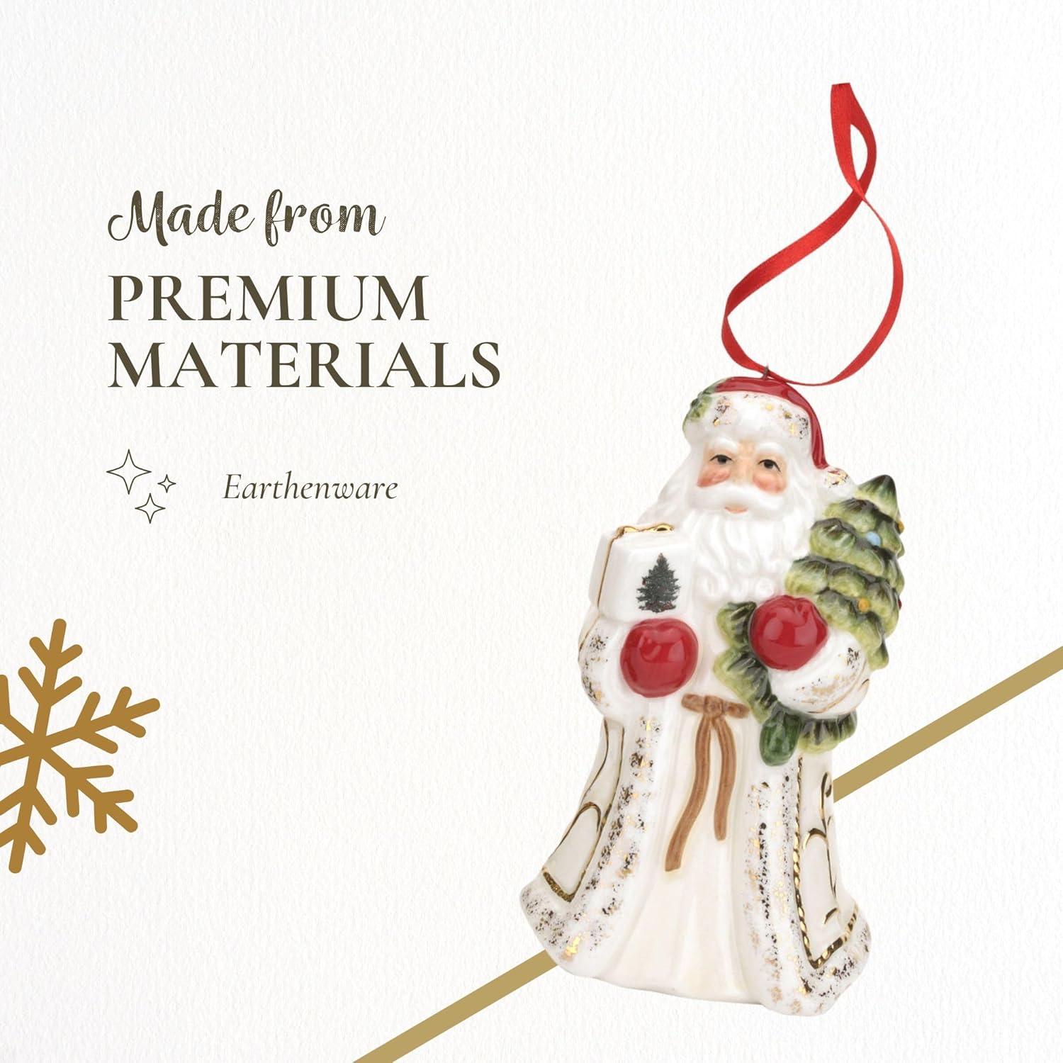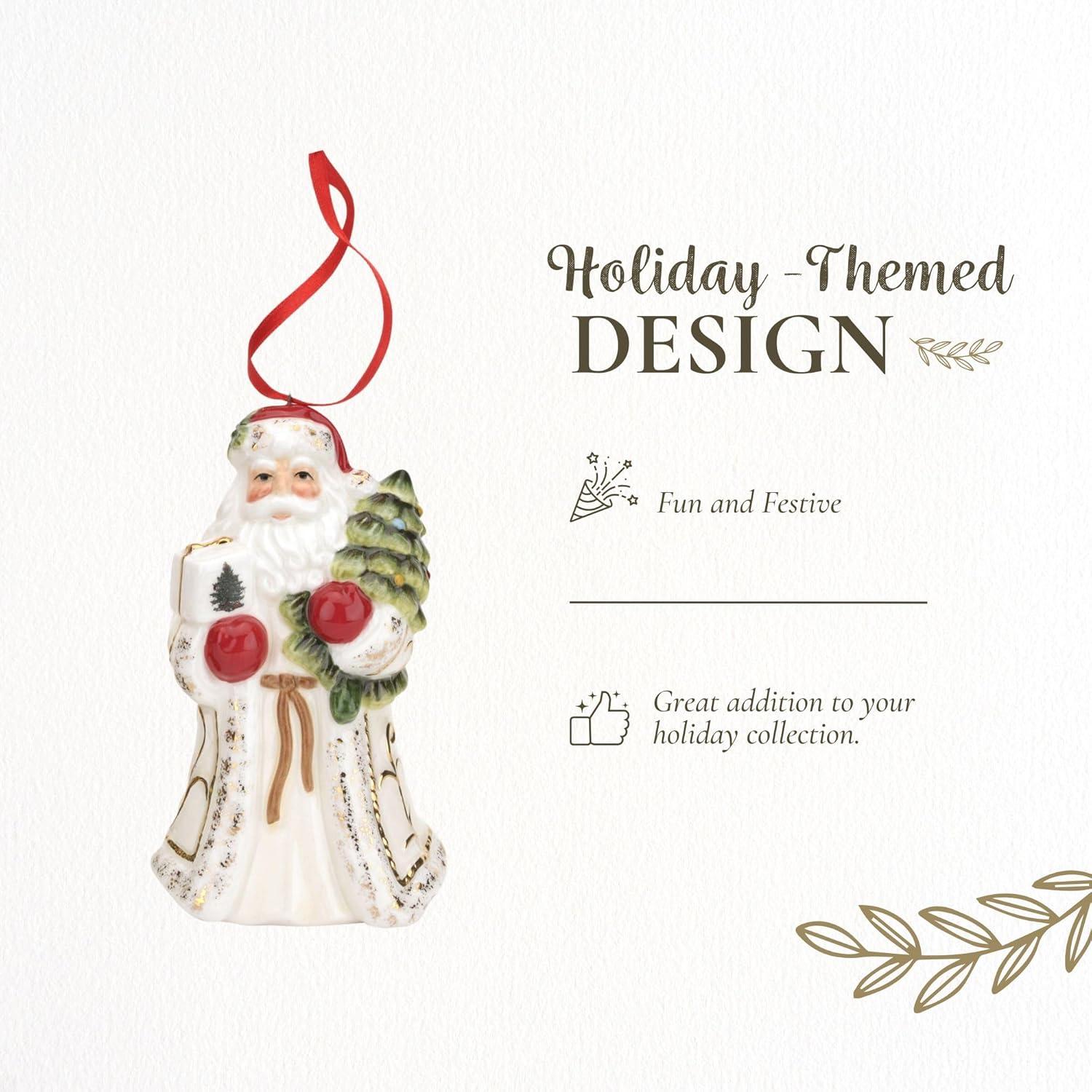 Spode's Christmas Collection: Introducing the Spode Christmas Tree Hanging Santa Ornament, this seasonal centerpiece adds a festive element to mantles, entryways, or tabletops. It adapts well to various holiday home accents and room layouts.