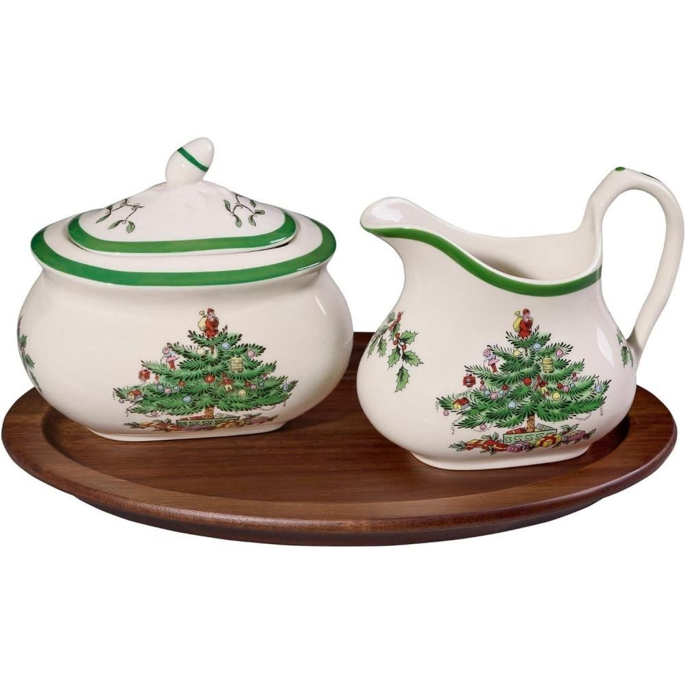 Spode Christmas Tree Sugar & Creamer Set (3-Piece) - Porcelain 16oz Sugar, 8oz Creamer Container, Wood Tray - Festive Holiday Tea & Coffee Serving Set - Dishwasher Safe Tableware for Gifting