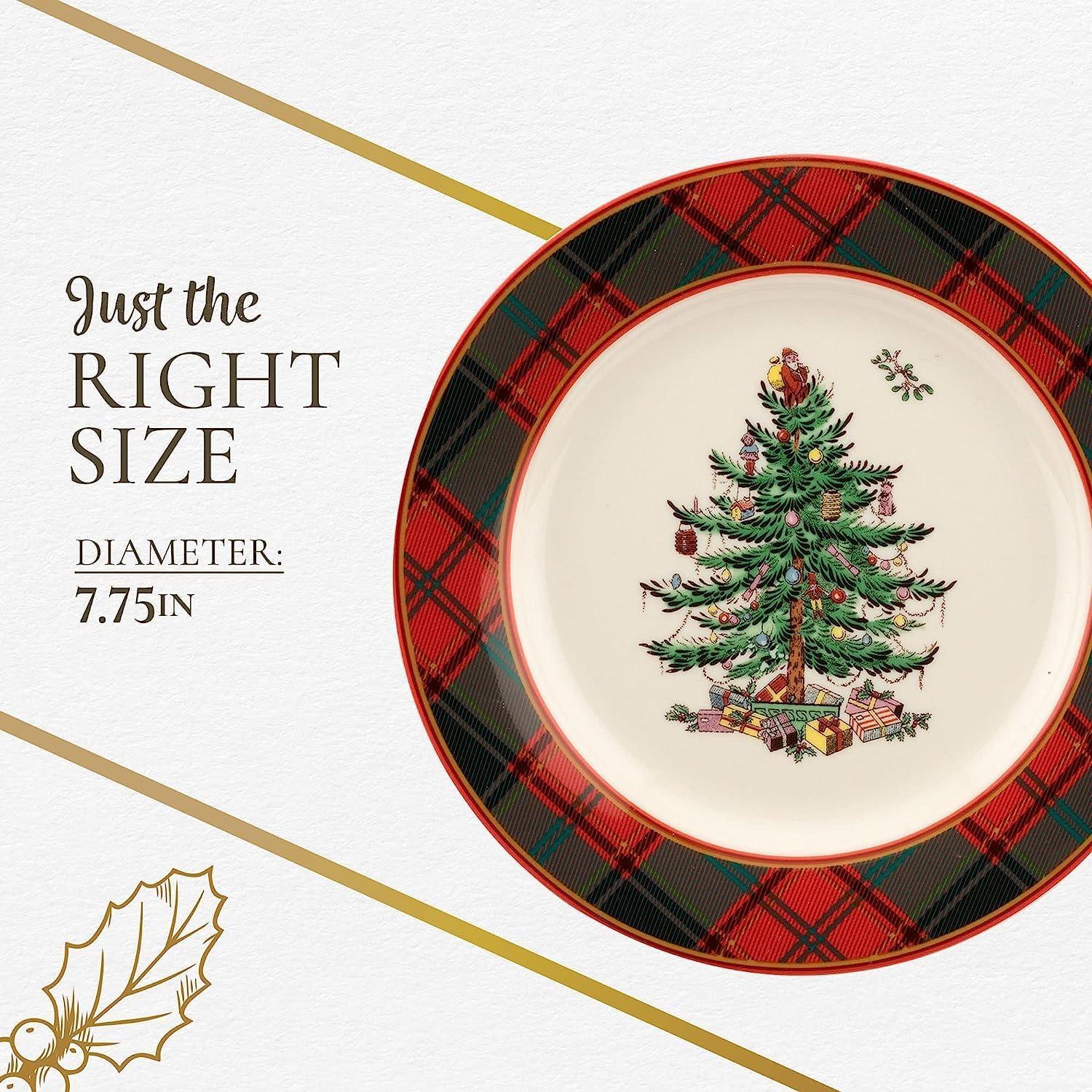 Elegant Design for the Holidays: This Spode Christmas Tree Tartan Salad Plate features a traditional tartan plaid border that brings rustic charm and sophistication to your holiday table setting. Ideal for adding festive flair to any occasion. .
