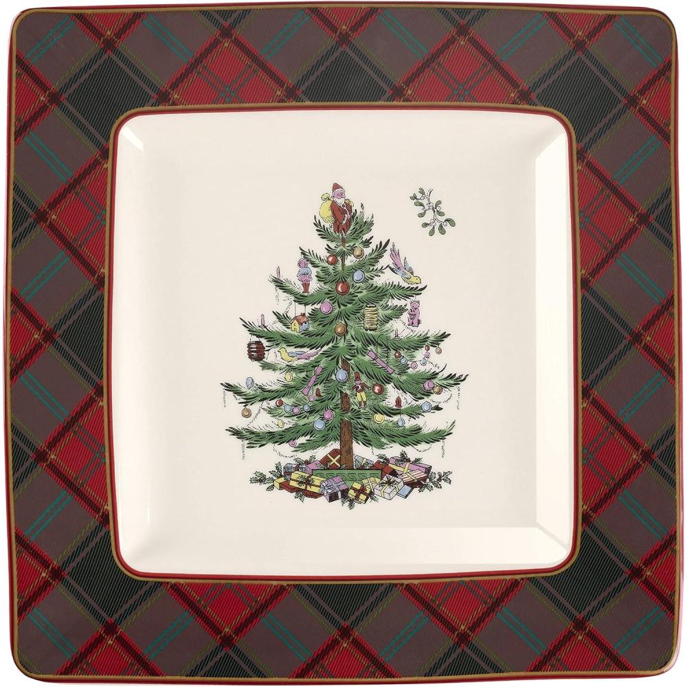 imageSpode Christmas Tree Tartan Square Platter  10Inch Holiday Serving Platter for Christmas Entertaining  Traditional Tartan Plaid Design with Iconic Tree Motif  Microwave and Dishwasher Safe