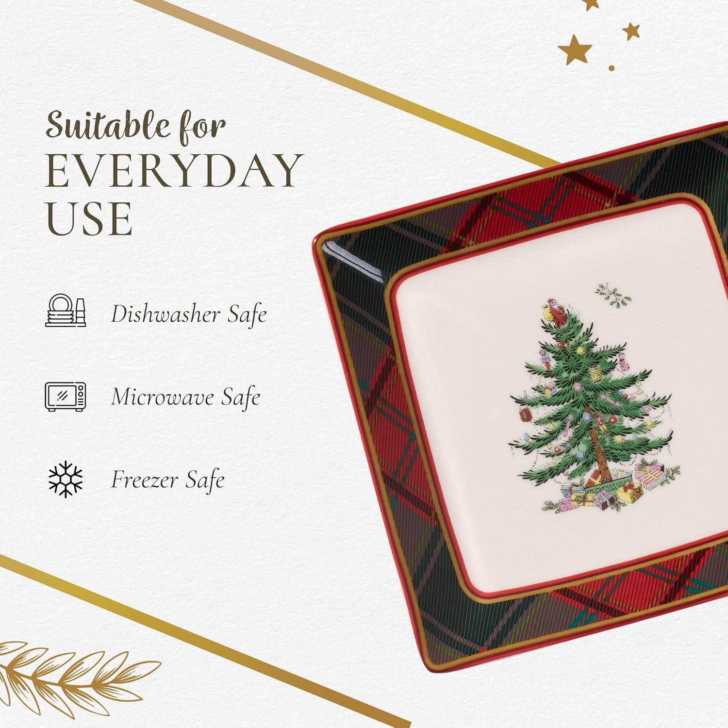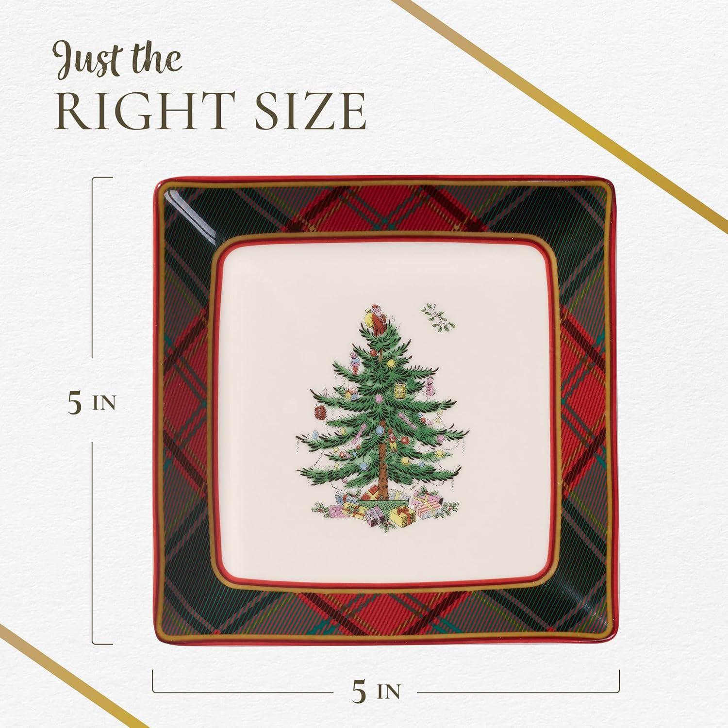 Classic Tartan Design: These 5-inch holiday serving platters showcase the iconic Spode Christmas Tree surrounded by a rustic tartan plaid border, combining traditional charm with festive elegance for your holiday table.