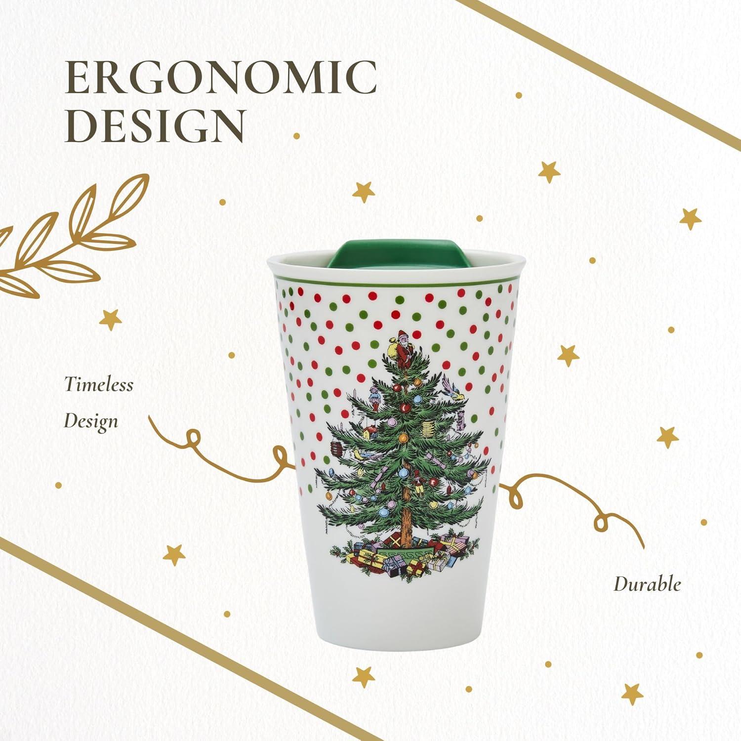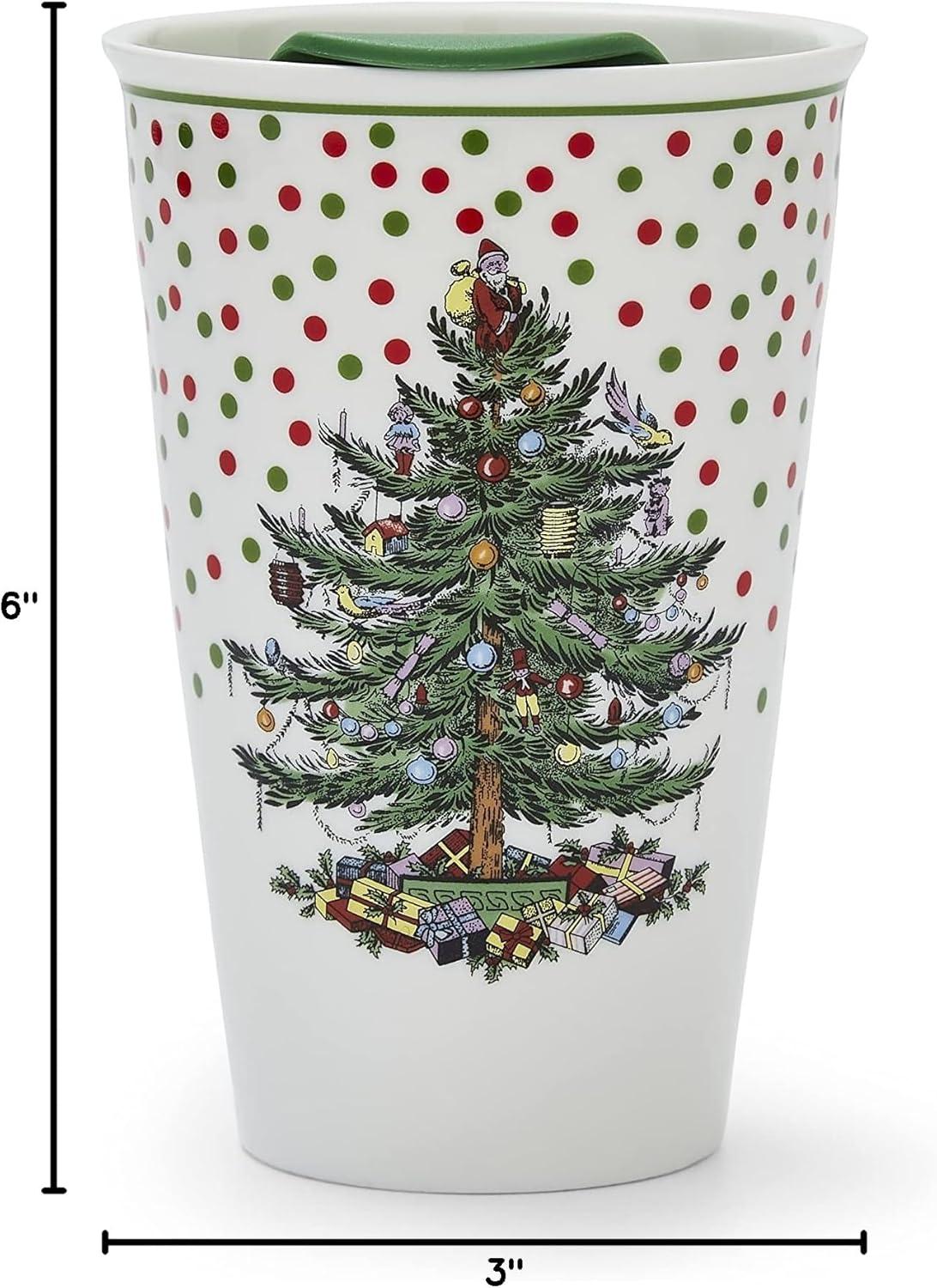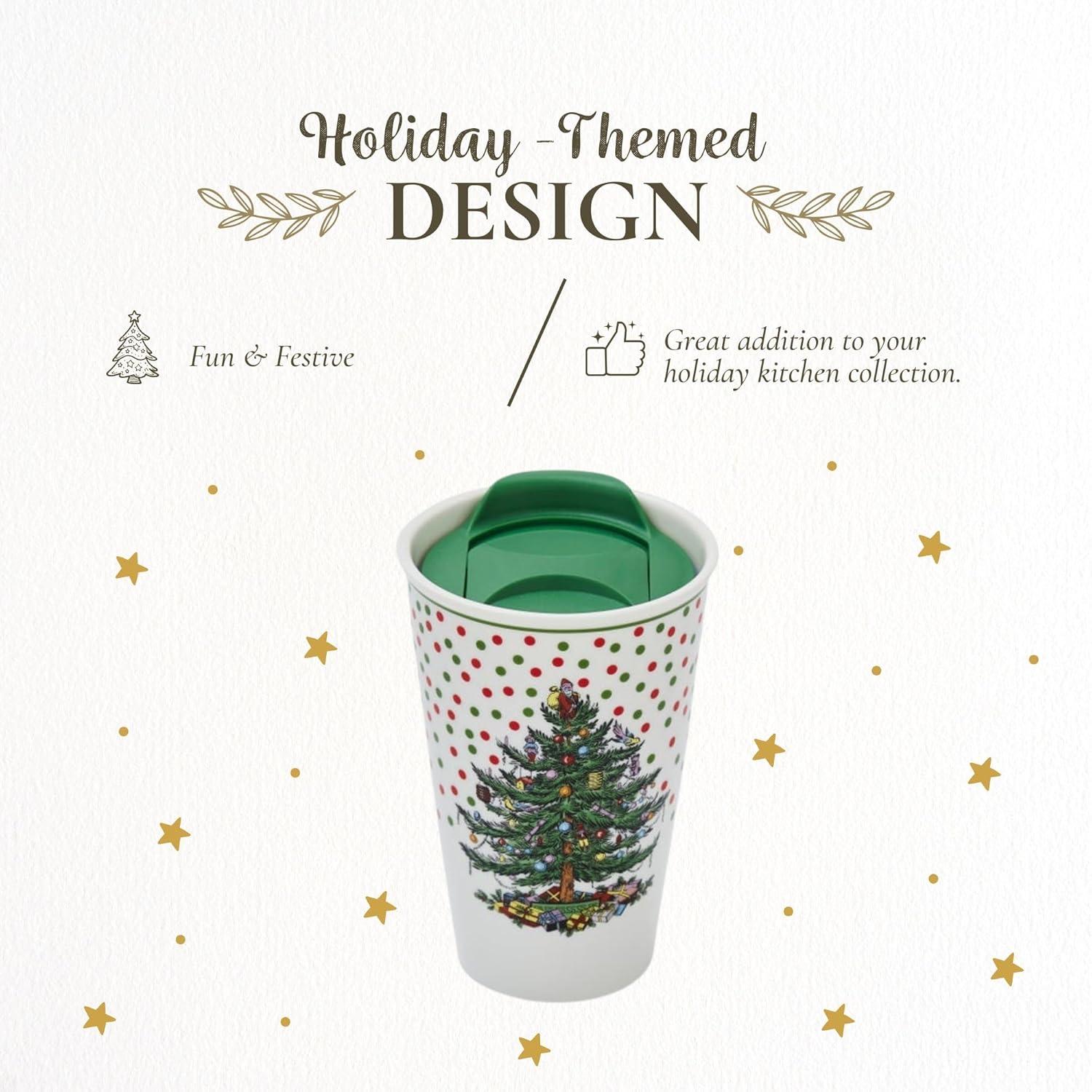 Festive Holiday Design: Celebrate the season with the iconic Spode Christmas Tree design on your travel coffee mug. Its classic tree imagery, combined with a green lid, brings festive joy to your coffee, tea, or hot chocolate wherever you go.
