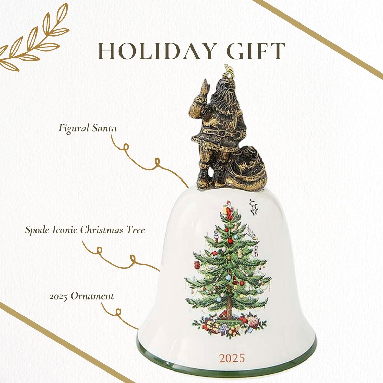 Spode Exclusive Holiday Collection, Tree Bauble Ornament - Porcelain Christmas Tree Decoration & Centerpiece, Red Ribbon & Black-White Check Wrap - Festive Keepsake for Gifting & Display(Bell 2025)